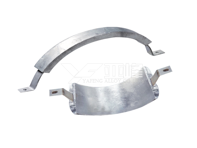 常用的鋁合金陽(yáng)極有Al-Zn-In系和Al-Zn-Hg系陽(yáng)極,適用于海水中的船舶、碼頭港口與海洋設(shè)施、海水冷卻水系統(tǒng)和儲(chǔ)罐沉積水部位等構(gòu)筑物的陰極保護(hù)。鋁鋅銦系(AZI系)犧牲陽(yáng)極是用高純度鋁及鋅、銦等金屬合金化而鑄成的。鋁合金陽(yáng)極生產(chǎn)執(zhí)行GB/T4948-2002《鋁-鋅-銦系合金犧牲陽(yáng)極》。