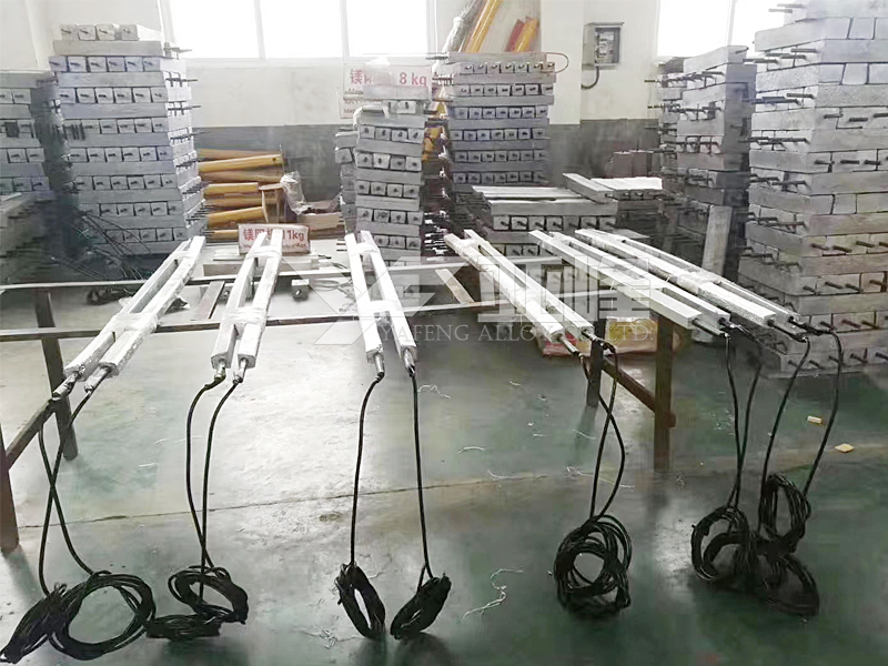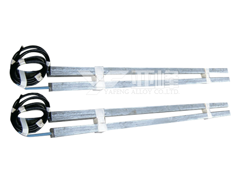 鋅接地電池由平行靠近的一對或四支鋅合金犧牲陽極棒組成,中間用絕緣墊塊隔開,然后一起裝在裝有填包料的棉布袋中,通過引出電纜焊接在絕緣裝置(絕緣接頭或法蘭)的兩側(cè),以防止強電沖擊引起的損壞,同時日常情況下接地電池也可對管道起保護(hù)作用。