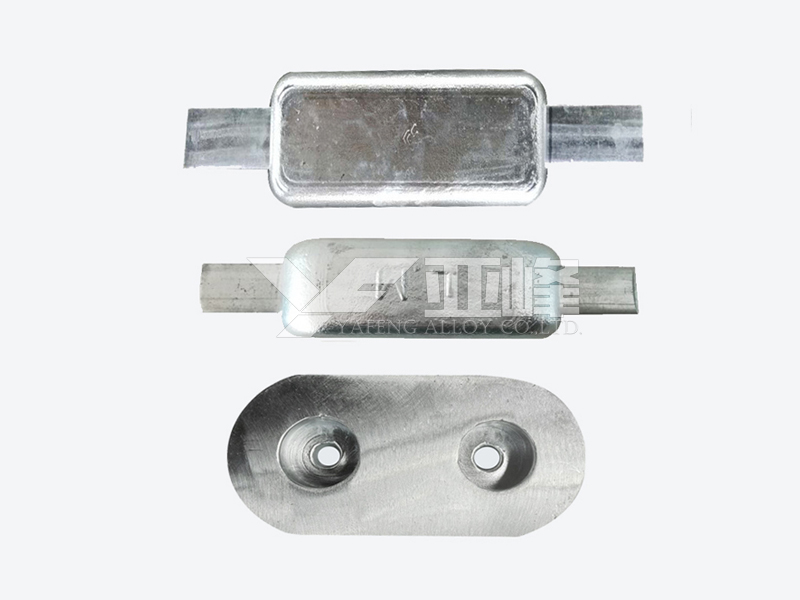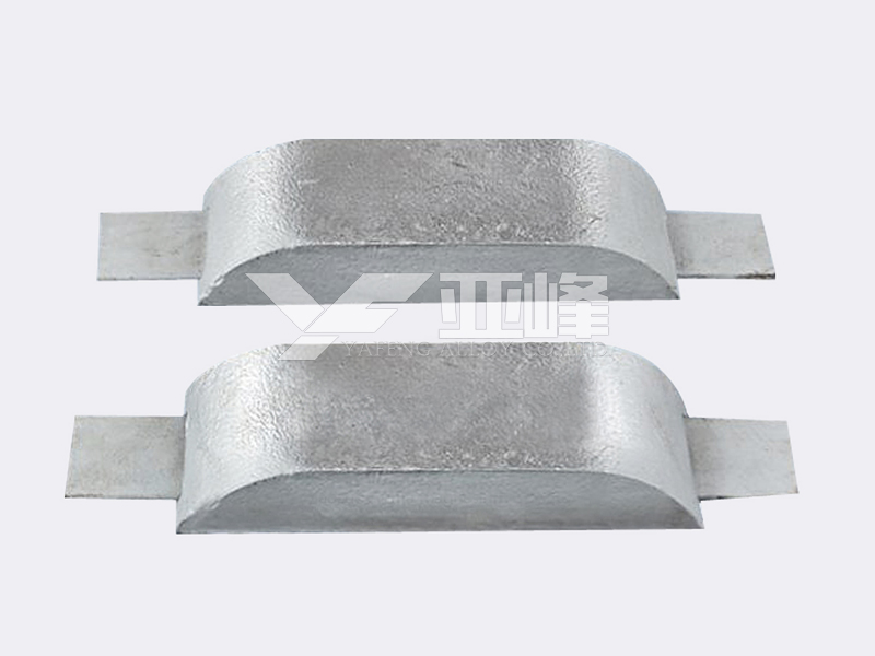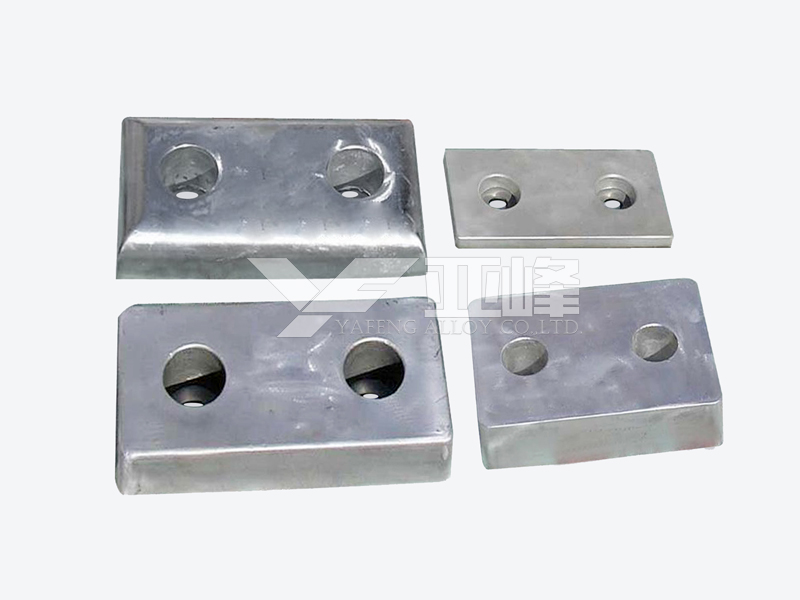 常用的鋁合金陽極有 Al-Zn-In 系和Al-Zn-Hg系陽極,適用于海水中的船舶、港工與海洋設(shè)施、海水冷卻水系統(tǒng)和儲(chǔ)罐沉積水部位等構(gòu)筑物的陰極保護(hù)。鋁合金陽極生產(chǎn)執(zhí)行 GB/T4948-2002《鋁-鋅-銦系合金犧牲陽極》。